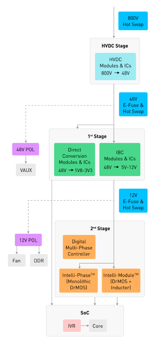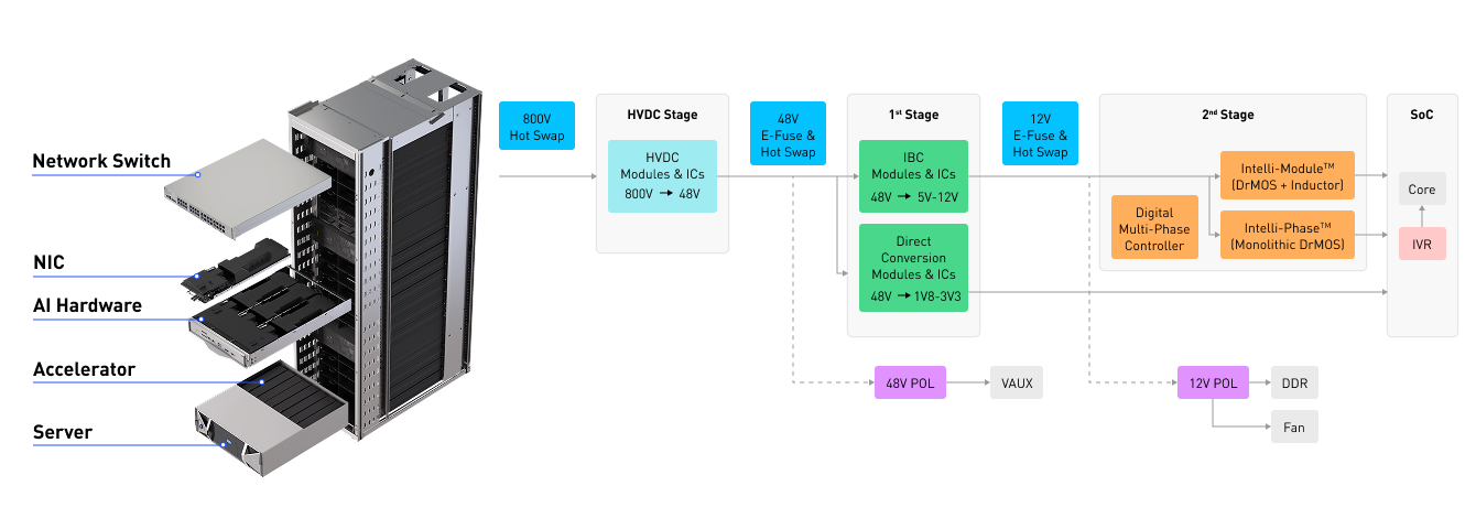 Current datacenters typically have a 12V backplane and distribution on board and need to convert the voltage down to around 1V, which is usually achieved with a synchronous buck regulator, single- or multi-phase.