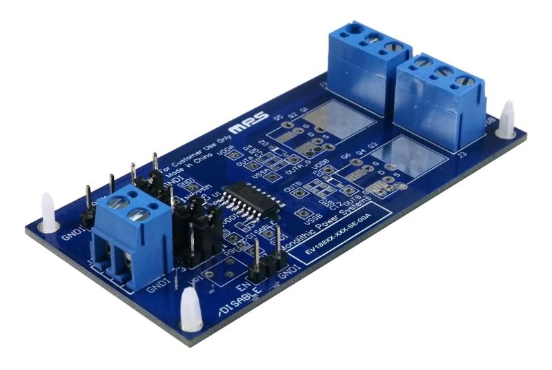The EV188XX-XXX-SE-00A is an evaluation board designed to demonstrate the capabilities of the MP188xx family, a dual-channel, isolated gate driver solution for driving power switching devices with a short propagation delay and minimal pulse-width distortion.
