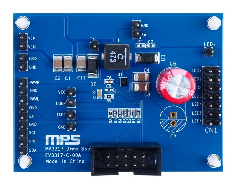 The EV3317-C-00A evaluation board is designed to demonstrate the capabilities of the MP3317. The MP3317 is a boost converter that features six-channel current sources to drive WLED arrays for LCD panels in virtual reality (VR) backlighting applications.