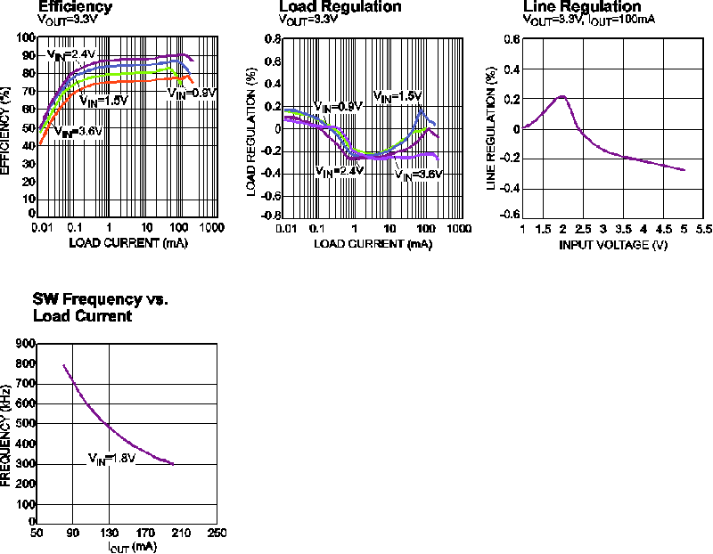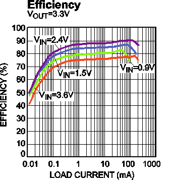 - 在 100μA-200μA 轻载条件下效率高达 80%