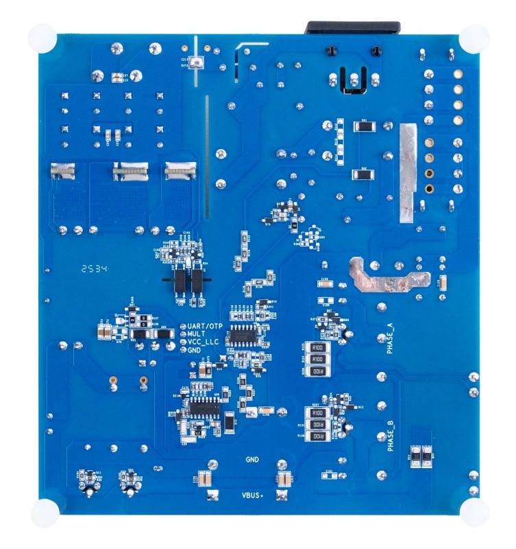 The LLC stage of the evaluation board implements three operation modes based on the load conditions. This allows the device to independently optimize efficiency under different load conditions. Over-current protection (OCP), OVP, over-power protection (OPP), and OTP have configurable protection behaviors.