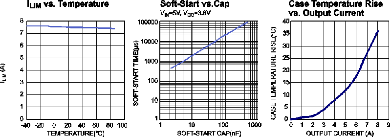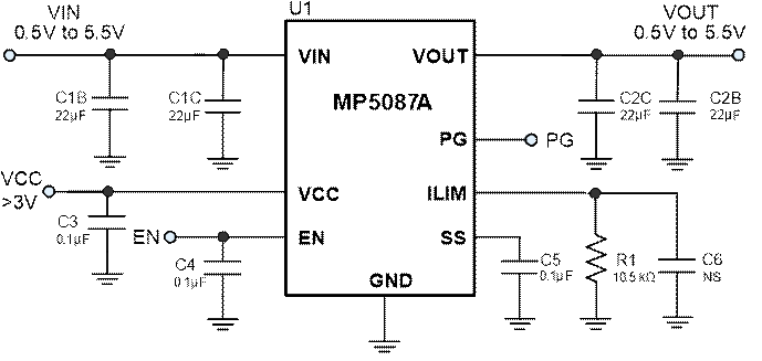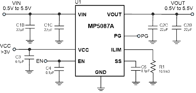 MP5087A 具有软启动功能,可避免电路启动时产生的的浪涌电流。该器件还提供可调软启动时间、输出放电、过流保护 (OCP) 以及过温关断保护等功能。