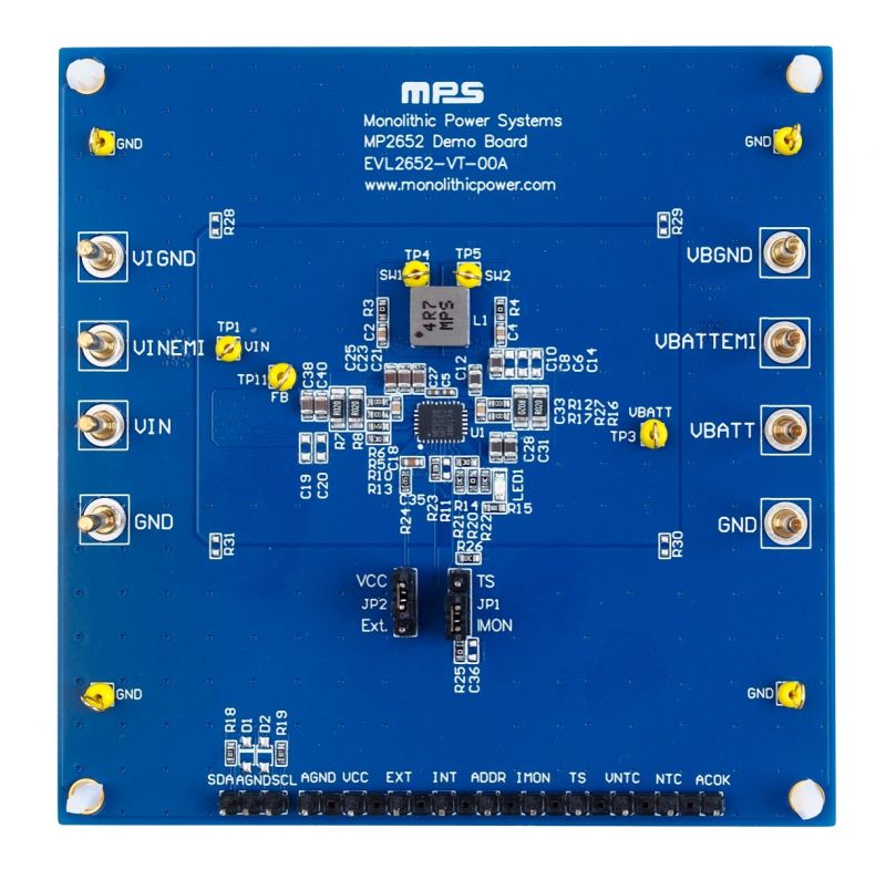 The EVL2652-VT-00A is an evaluation board designed to demonstrate the capabilities of the MP2652, a buck-boost charger IC designed for 2-cell to 5-cell series battery packs. The device can accept a wide 4V to 22V input voltage (VIN) range to charge the battery. It also supplies a wide voltage range (4V to 21V) at the IN pin in source mode, which is compliant with USB power delivery (PD) specifications.