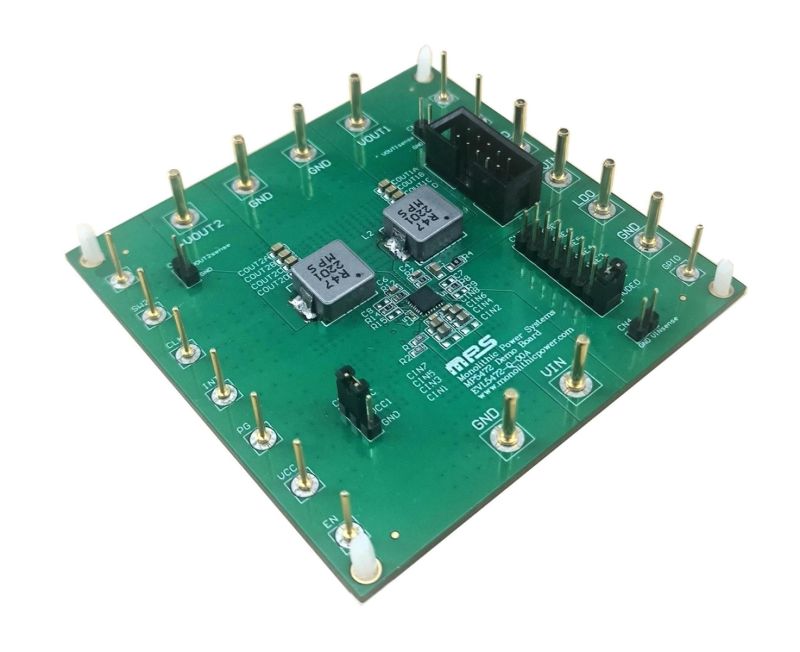 The EVL5472-Q-00A evaluation board is designed to demonstrate the capabilities of the MP5472, a complete power management IC (PMIC) that integrates two highly efficient stepdown DC/DC converters, one adjustable-output low-dropout (LDO) regulator, and flexible logic interface.