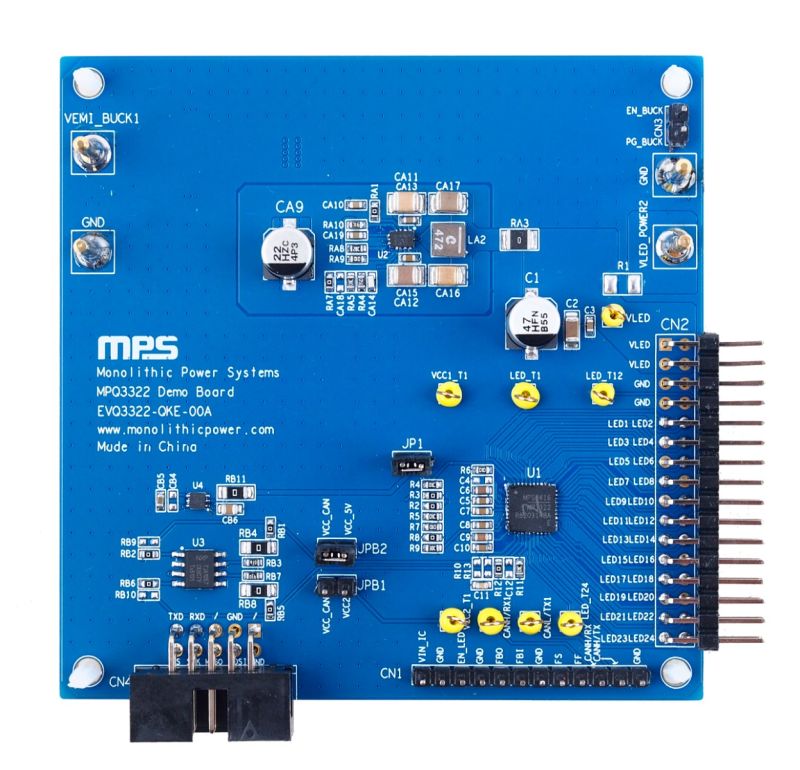 The EVQ3322-QKE-00A evaluation board is designed to demonstrate the capabilities of the MPQ3322-AEC1, a 24-channel LED driver with a 24V voltage rating and maximum 100mA current source. It is designed to drive LEDs as backlighting, RGB lighting, and interior ambient lighting in automotive LCD panels and lamps.