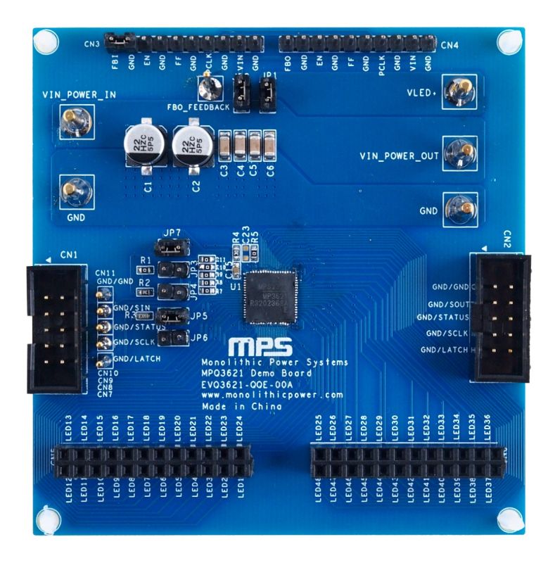 The EVQ3621-QQE-00A evaluation board is designed to demonstrate the capabilities of the MPQ3621-AEC1, a 48-channel LED driver with a 12V voltage rating and maximum 50mA current sources. It is designed to drive the LED arrays for local dimming backlighting in automotive LCD panels.