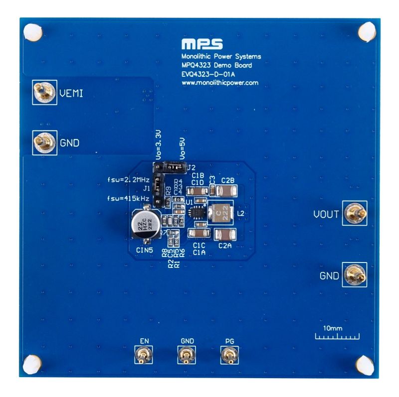 EVQ4323-D-01A 是用于演示 MPQ4323GDE-AEC1 功能的评估板。MPQ4323GDE-AEC1 是一款频率可调(350kHz 至 2.5MHz)的同步降压开关稳压器,集成内部上管 MOSFET(HS- FET)和下管 MOSFET(LS-FET)。
