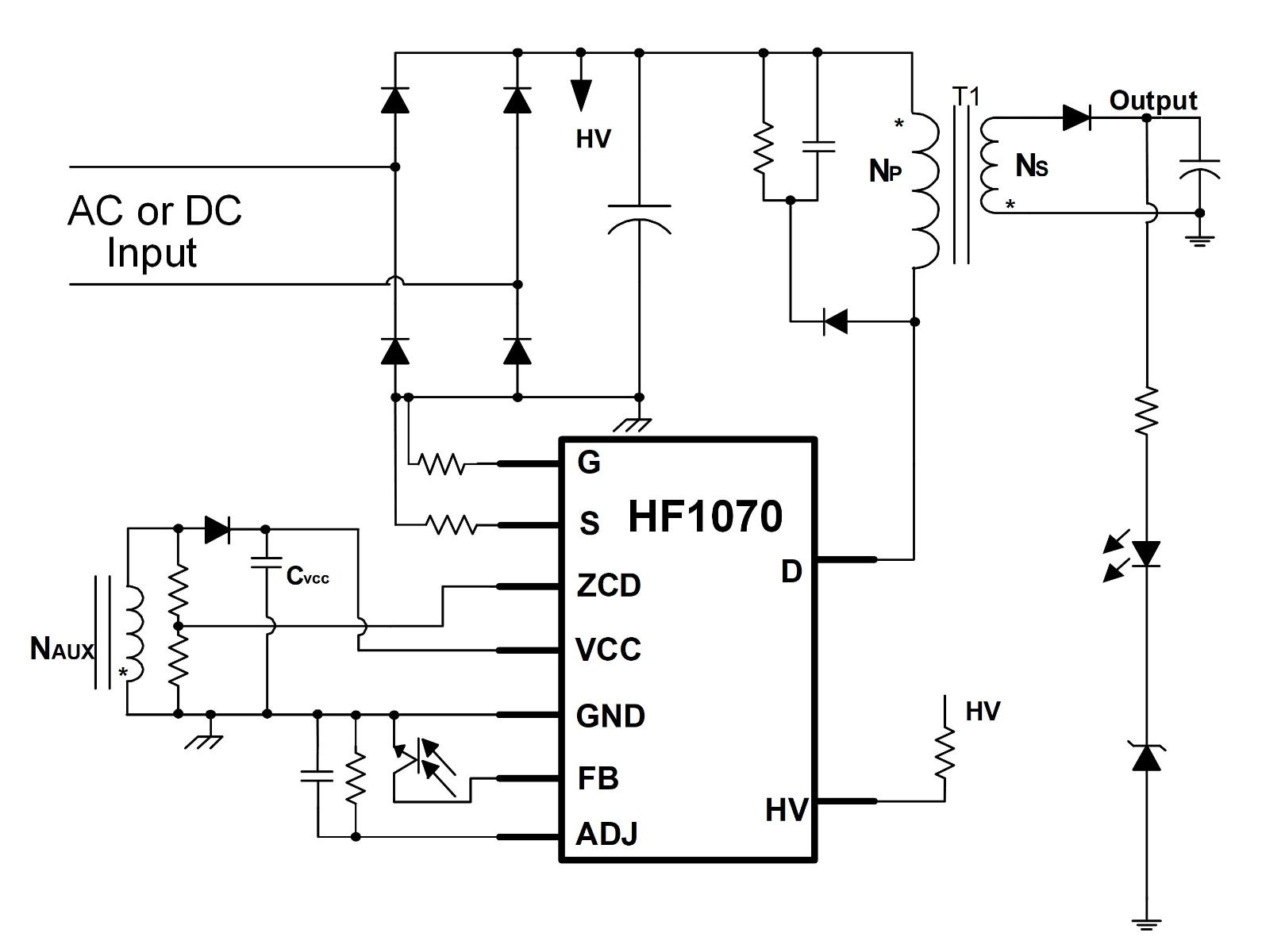 HF500-30 具备全方位保护功能,包括欠压保护/开启、VCC 欠压锁定(UVLO)保护、过载保护(OLP)、短路保护(SCP)、输入过压保护、VCC 过压保护(OVP)和过温保护(OTP)。