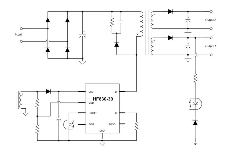 The HF830-30 is an offline regulator with one rugged 800V MOSFET and a full-featured controller integrated into a single chip.