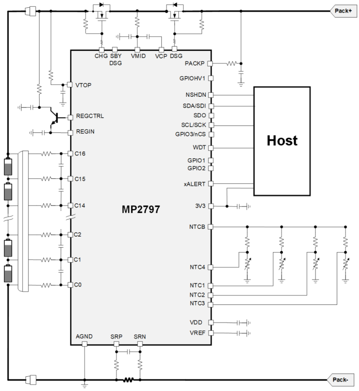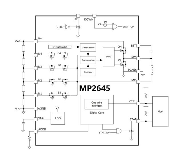 此外,还有电池监控、保护、电量计全集成产品——MPF117xx。该方案集成了3s-8s 高精度AFE,支持MOSFET软启动,同时集成了混合模型电量计,电量状态(SOC)精度高达2.5%。MPF117xx也支持基于SOC的主动均衡控制,能和MP2645主动均衡芯片无缝交互。该方案可大幅降低软件开发的工作量,助力缩短产品上市时间。