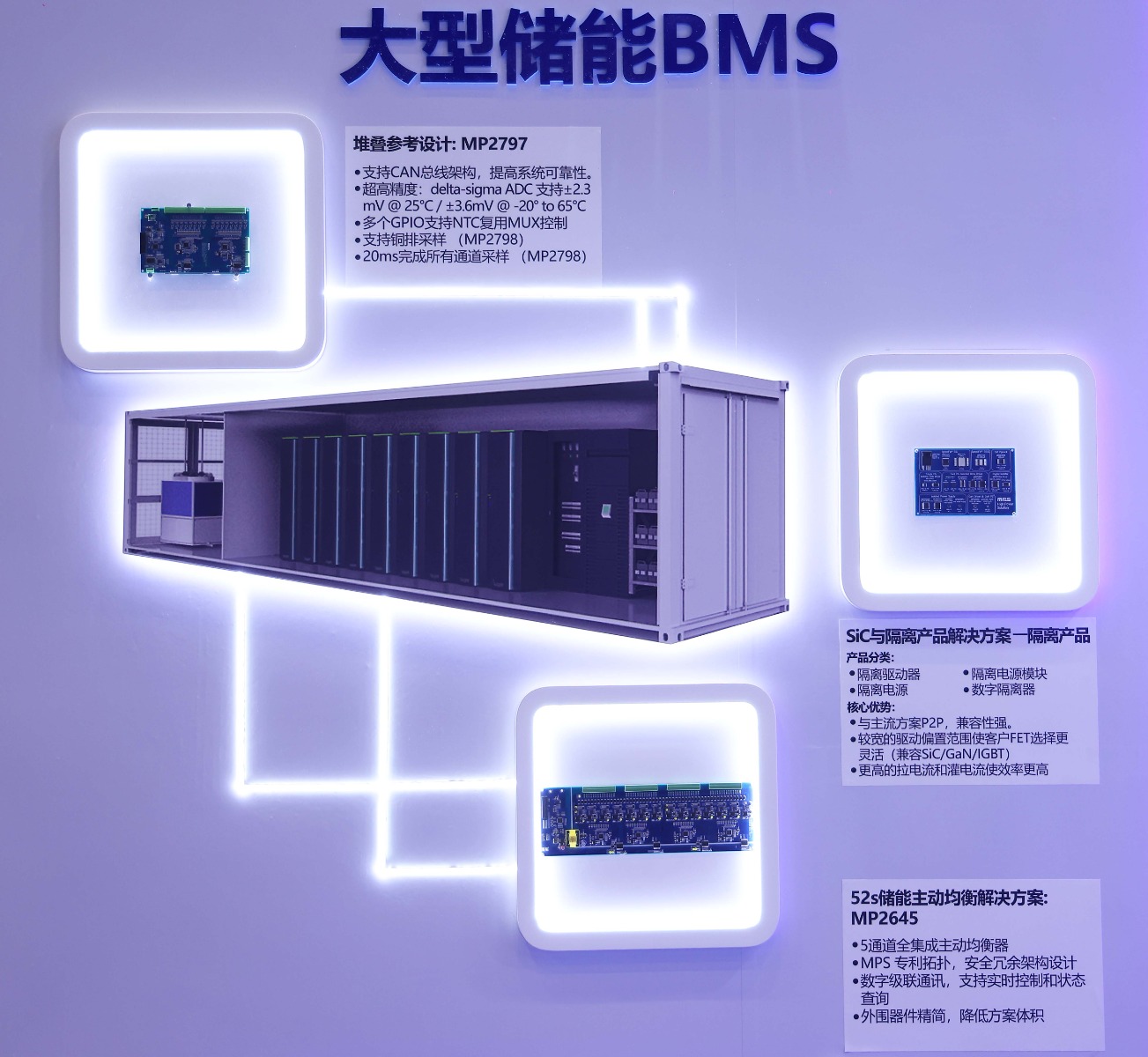 随着光伏、风电等新能源快速发展,大型储能系统在电网侧的应用日益重要,其主要作用是为新能源接入提供缓冲,提升电网稳定性。针对大型储能系统,MPS展示了基于MP2797和MP2645的两套关键解决方案,满足高串数、高功率储能系统的工程化需求。