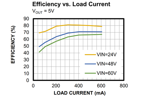 MPM3572 效率负载曲线图(VOUT = 5V,VIN = 24V / 48V / 60V)