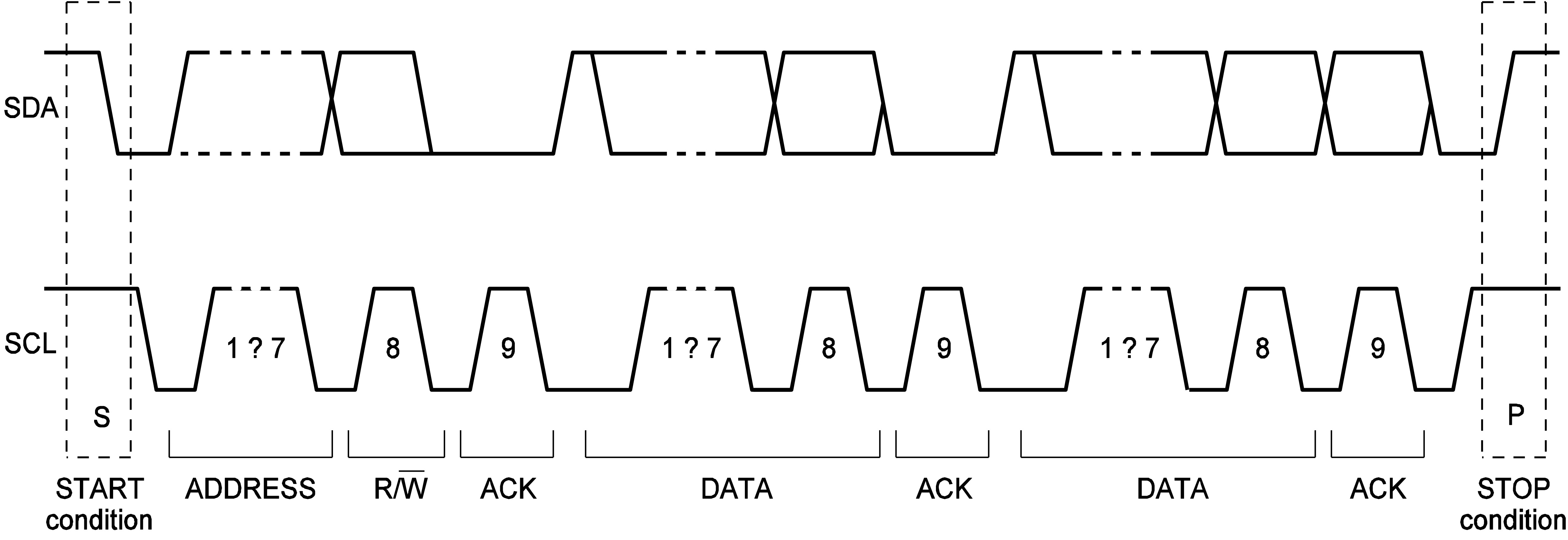 Every byte put on the SDA line must be 8 bits long. Each byte must be followed by an acknowledge (ACK) bit. The acknowledge-related clock pulse is generated by the master.