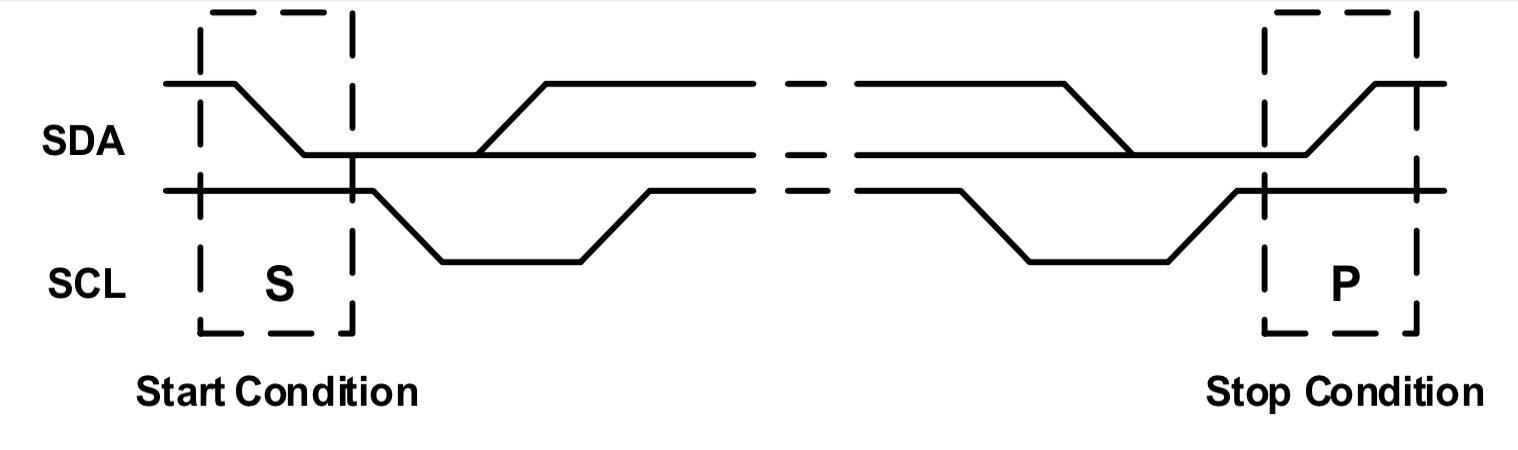 Start and stop conditions are signaled by the master device, which signifies the beginning and the end of the I2C transfer. A start condition (S) is defined as the SDA signal transitioning from high to low while the SCL is high. A stop condition (P) is defined as the SDA signal transitioning from low to high while the SCL is high (see Figure 5).