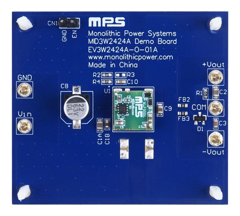 The EV3W2424A-O-01A is an evaluation board designed to demonstrate the capabilities of the MID3W2424A, an unregulated, 3kVRMS, isolated DC/DC converter designed for 24V ±10% input voltage (VIN) applications. The MID3W2424A supports up to 3W of output power (POUT). Due to its excellent common-mode transient immunity (CMTI) performance, the device is suitable for powering IGBT or silicon carbide (SiC) MOSFET gate drivers that require fast switching speed.