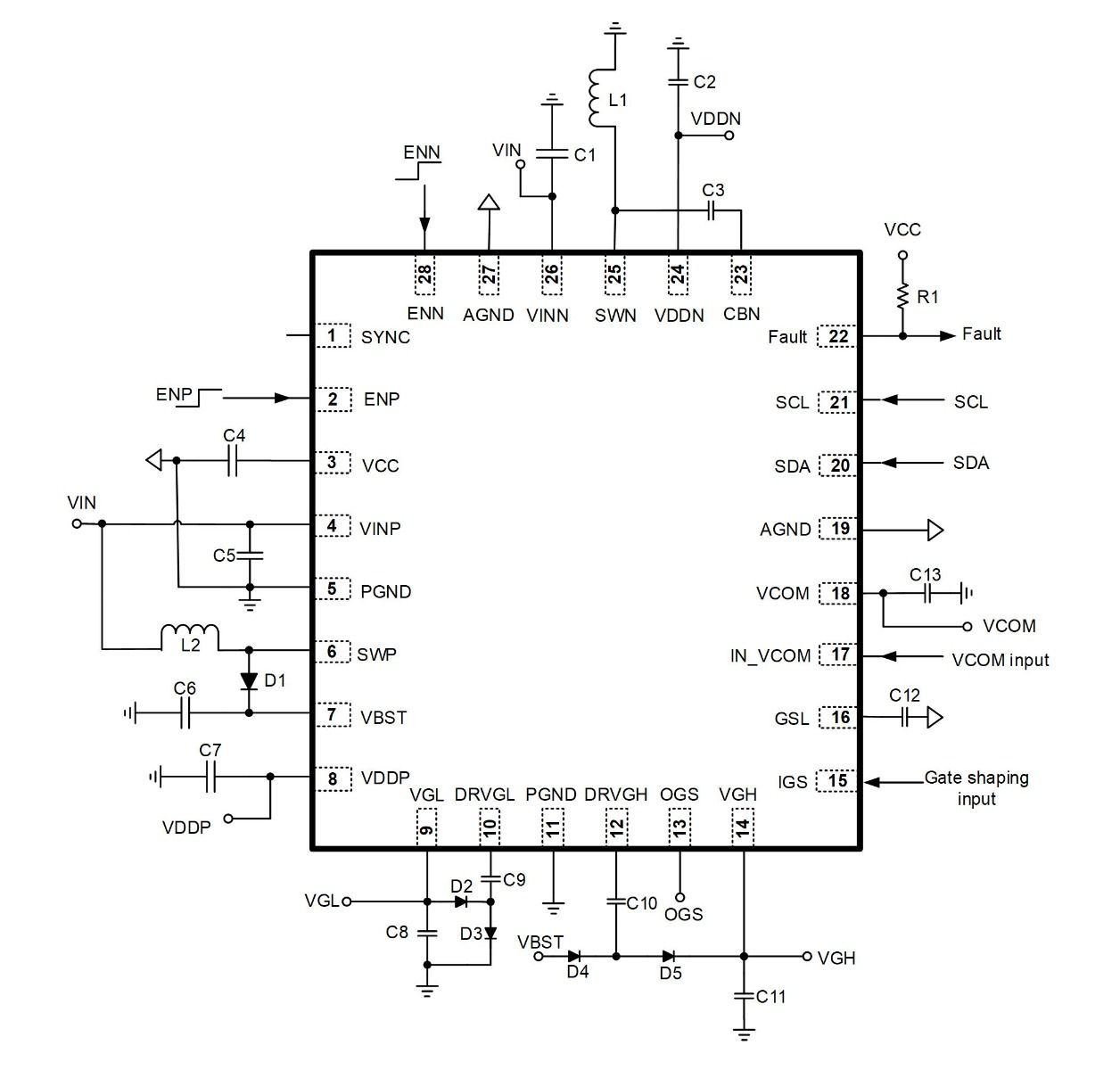 MP1530 包含一个1.4MHz的定频升压变换器和一个正反向线性调节器。线性调节器由充电泵供电,而充电泵则由升压变换器开关节点(SW)驱动。