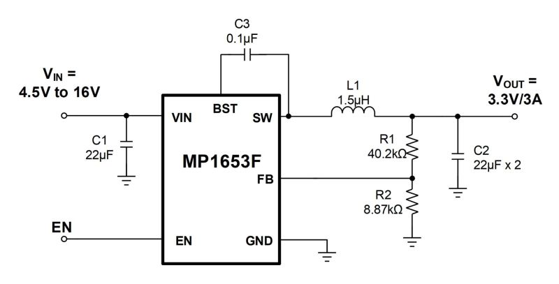The MP1653F can achieve up to 3A of continuous output current (IOUT) from a 4.5V to 16V input voltage (VIN) range, with excellent load and line regulation. The output voltage (VOUT) can be regulated to as low as 0.6V.