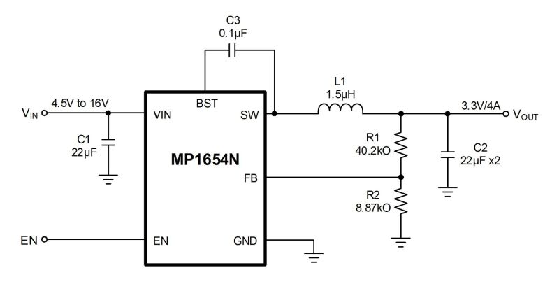 The MP1654N can achieve up to 4A of continuous output current (IOUT) from a 4.5V to 16V input voltage (VIN) range, with excellent load and line regulation. The output voltage (VOUT) can be regulated to as low as 0.6V.