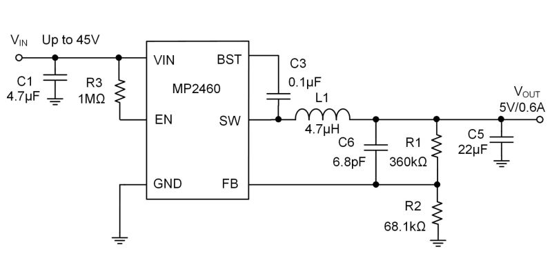 MP2460 具有多项内置保护功能,例如逐周期限流、带打嗝模式的短路保护 (SCP) 和过温关断保护。 MP2460 采用高性价比的 TSOT23-6 封装。