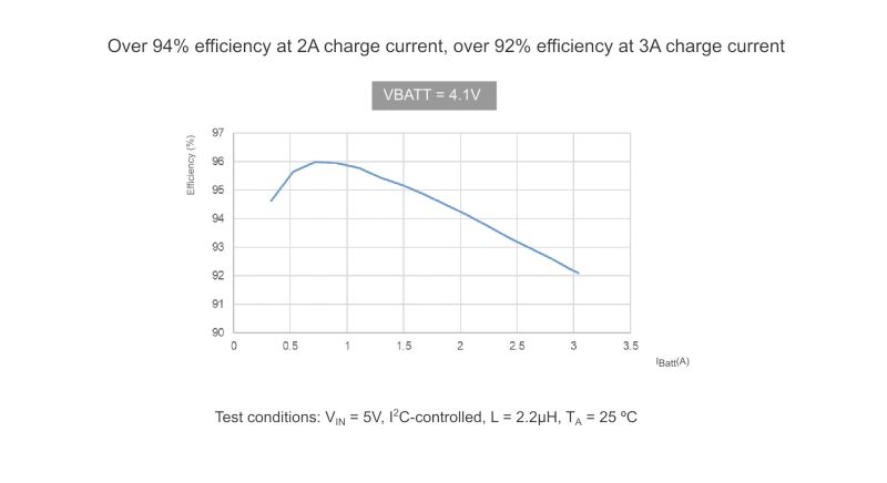 - 在 3A 充电电流 (ICHARGE) 下,充电效率高达 92%