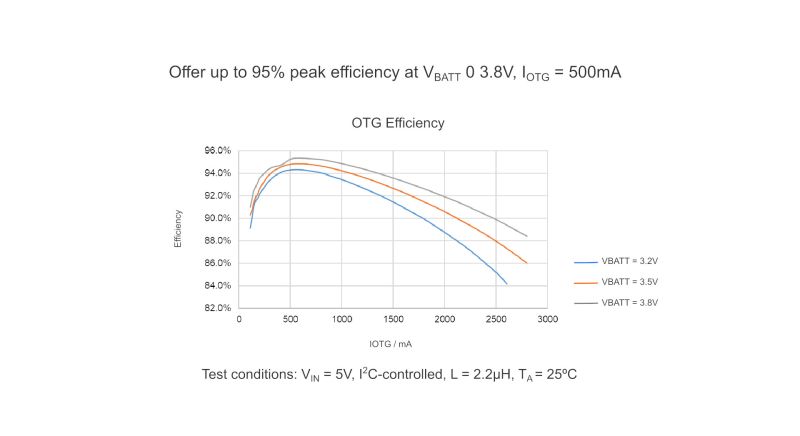 - 具有4.8V 至 5.5V 可调输出电压(VOUT)的 USB OTG功能,在输出电流高达 1.5A 时效率高达93%
