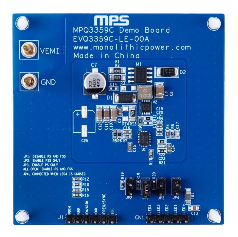 The EVQ3359C-LE-00A is an evaluation board designed to demonstrate the capabilities of the MPQ3359C-AEC1 and MP3359C, which are four-channel, step-up converters that drive white LED (WLED) arrays as backlighting for medium-sized LCD panels.
