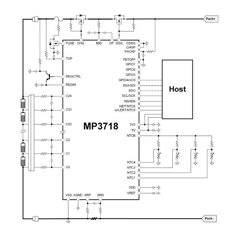 The MP3718 is a robust battery management device, providing a complete analog front-end (AFE) monitoring and protection solution. It is designed for multiple-cell series battery management systems (BMS). This device can support I2C or SPI communication. It supports connections for 4-cell to 24-cell series battery packs, with an absolute voltage that exceeds 140V on specific pins.