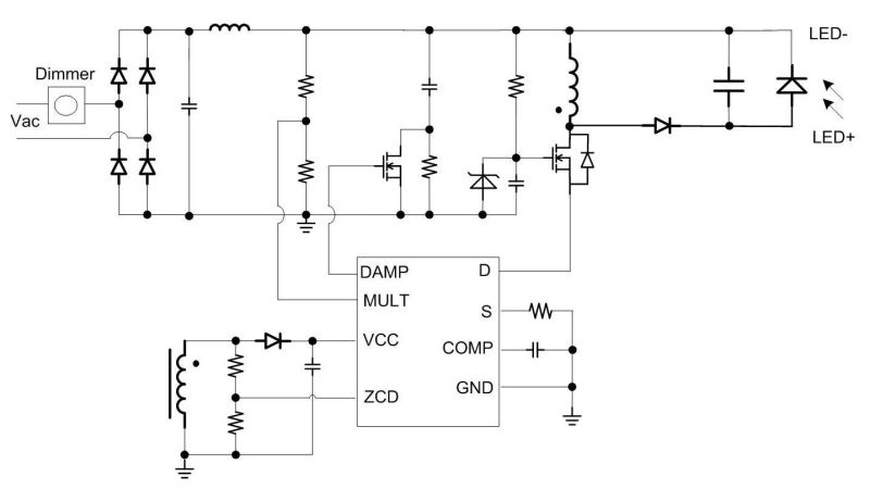 它在临界导通模式下工作,以减少 MOSFET 和二极管开关损耗。它提供自适应调光器类型检测和基于切相的调光控制,能够实现良好的调光器兼容性和深度调光范围。