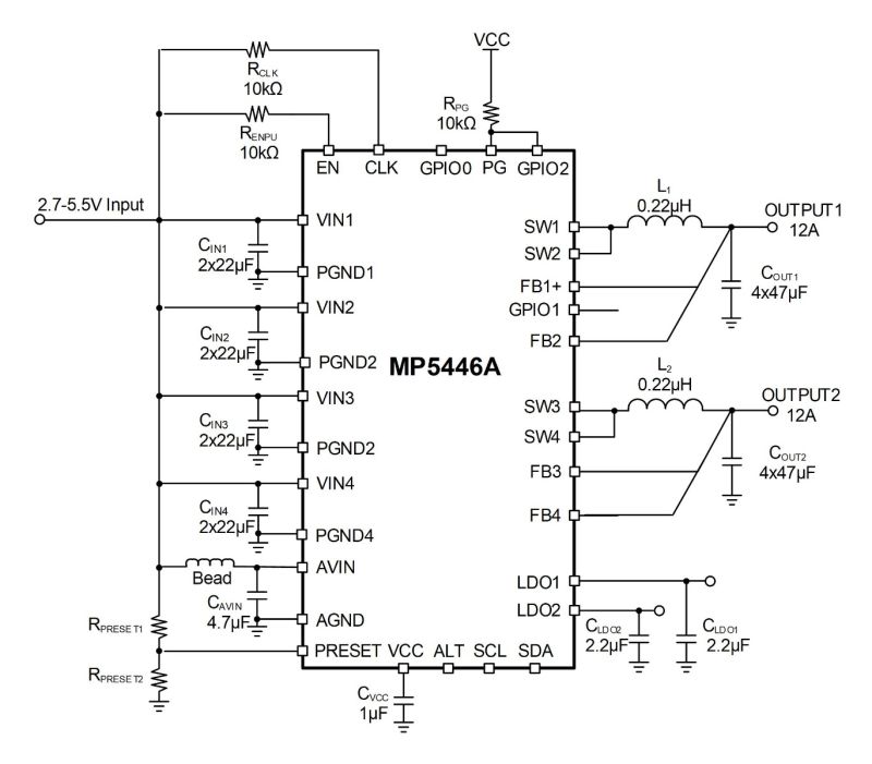 The MP5446A offers a highly integrated solution that delivers up to 6A of peak output current (IOUT) per channel, with excellent load and line regulation across a wide input voltage (VIN) supply range. The MP5446A’s four bucks can work in parallel to provide peak 12A or 24A of output current (IOUT). In addition, buck 1 supports remote voltage sense.