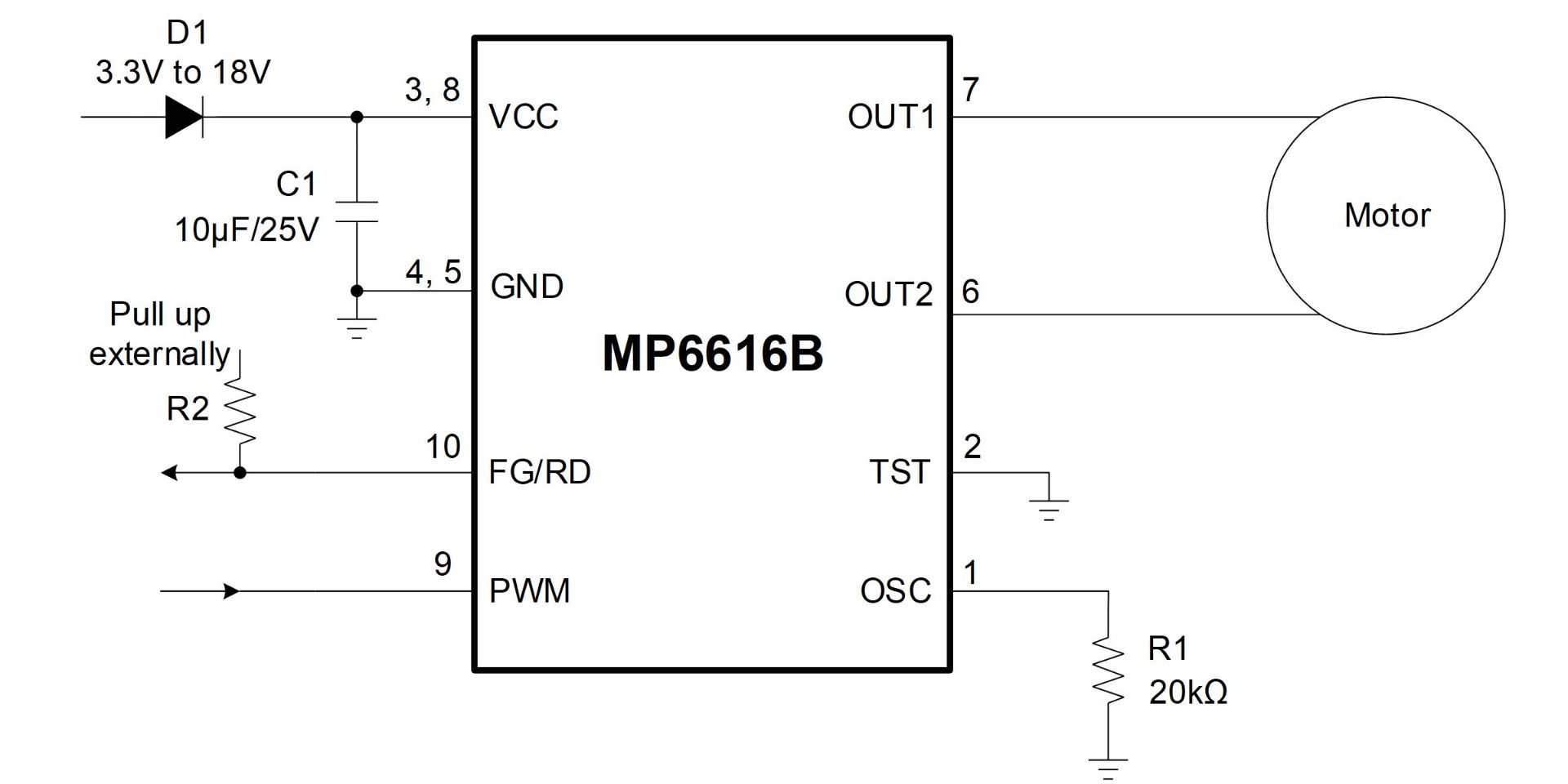 MP6616B产品带闭环/开环速度控制和增强型 ESD 功能的18V、2A、单相 BLDC 电机驱动器
