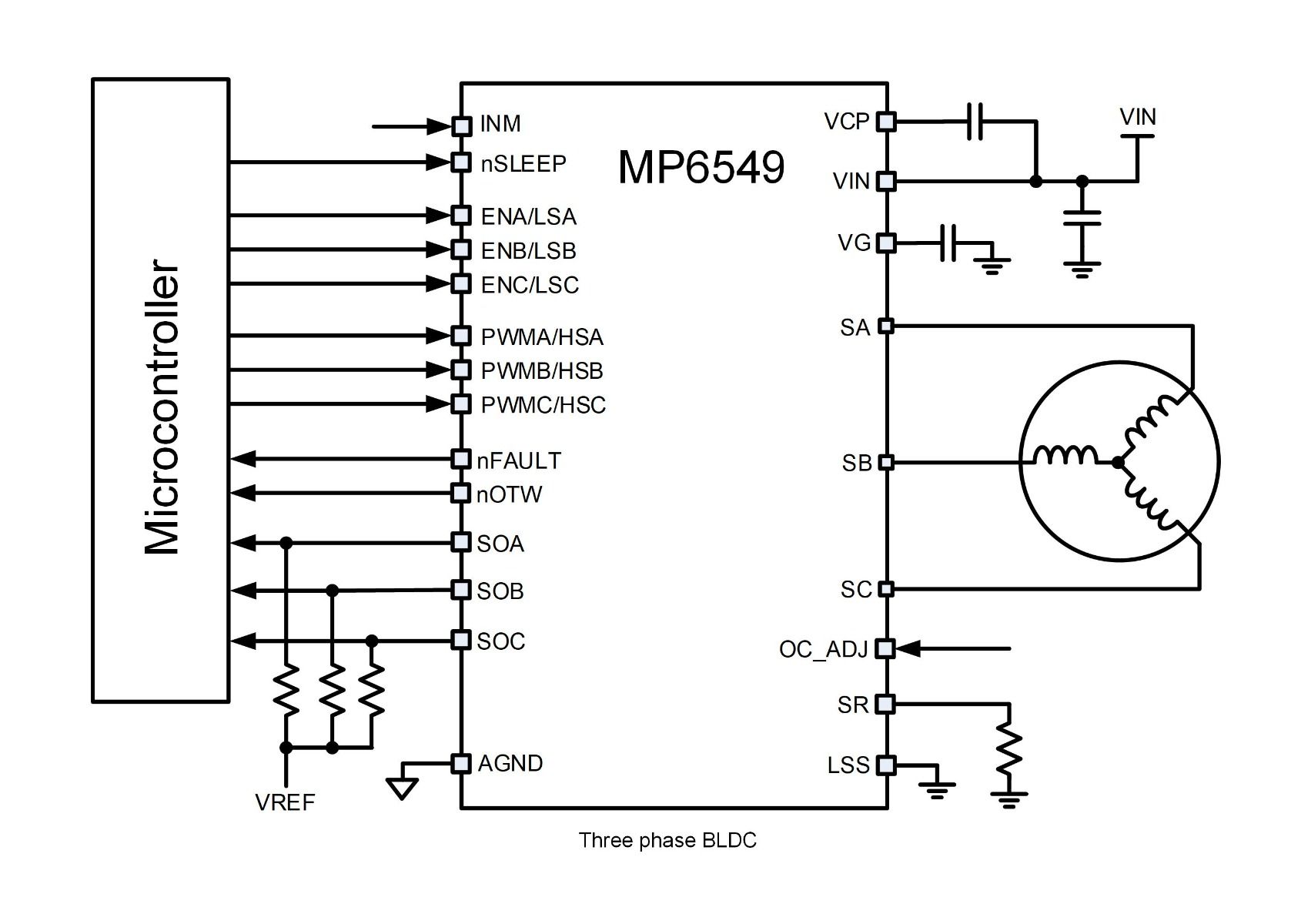 其工作电压高达35V。它集成了由 6 个N-通道功率 MOSFET 组成的3个半桥。由装在电机内部的霍尔传感器提供转子位置信息,由外部控制器生成驱动控制信号,如MCU、FPGA等。