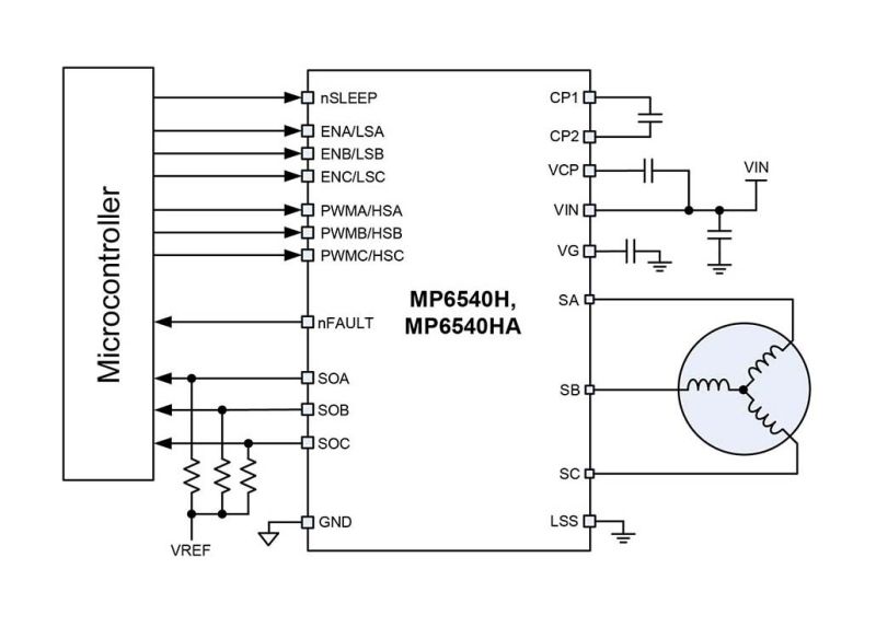 其转子位置信息由装配在电机中的霍尔传感器提供,而驱动控制信号由外部控制器(例如MCU,FPGA等)生成。