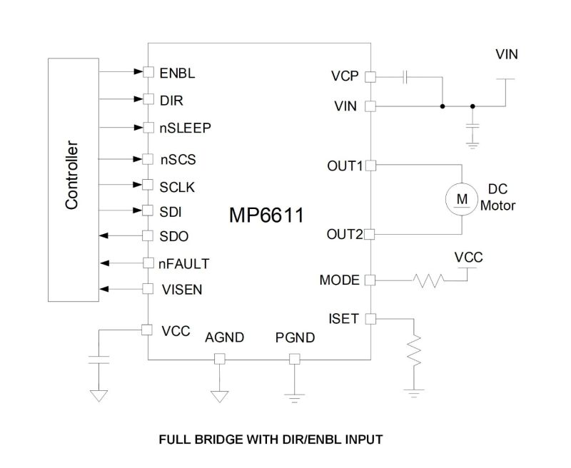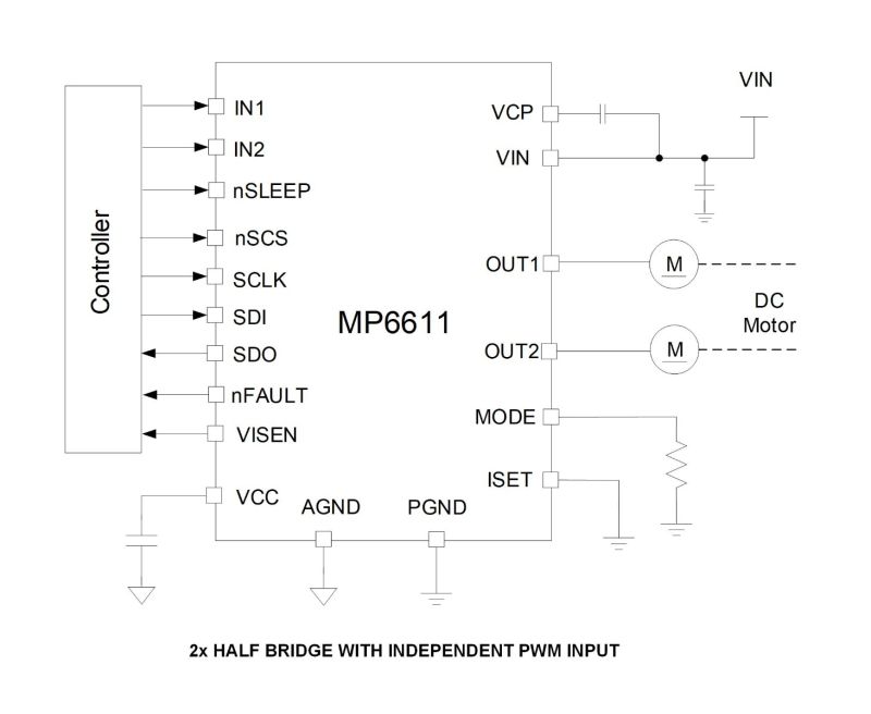 MPQ6611-AEC1的输出控制通过 IN1/ENBL/PWM 和 IN2/DIR/EN 引脚、串行接口,或两者的结合来实现。MODE引脚用于设置控制模式,例如IN1/IN2、DIR/ENBL 或独立脉宽调制 (PWM)等输入信号逻辑。