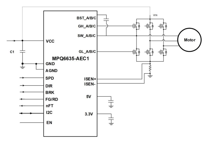 The MPQ6635-AEC1 is a three-phase, sensorless, brushless DC (BLDC) motor driver with a configurable gate driver. It features sensorless field-oriented control (FOC) for improved efficiency and low vibration. The input voltage (VIN) ranges between 6V and 35V.
