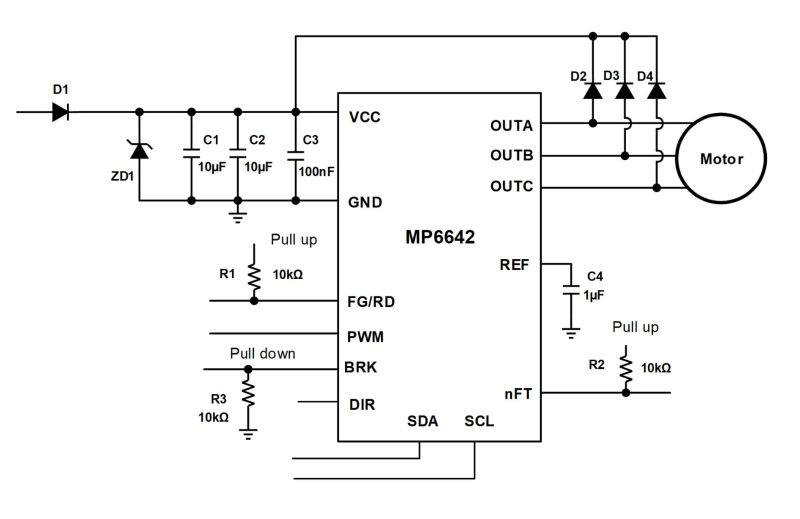 MP6642丰富的保护功能包括输入过压保护 (OVP)、欠压锁定 (UVLO)保护、堵转保护、缺相保护、过流保护 (OCP)、欠流保护 (UCP) 和过温关断保护。