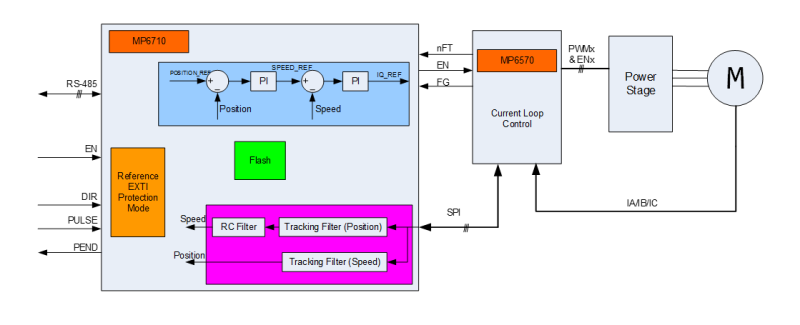 MP6710 具有 3 种工作模式可选,包括速度控制模式、位置控制模式和转矩控制模式。可通过数字接口或 PULSE/DIR 输入引脚来提供参考指令。采用 12 位 ADC 对 DC 电压和温度进行精确采样。