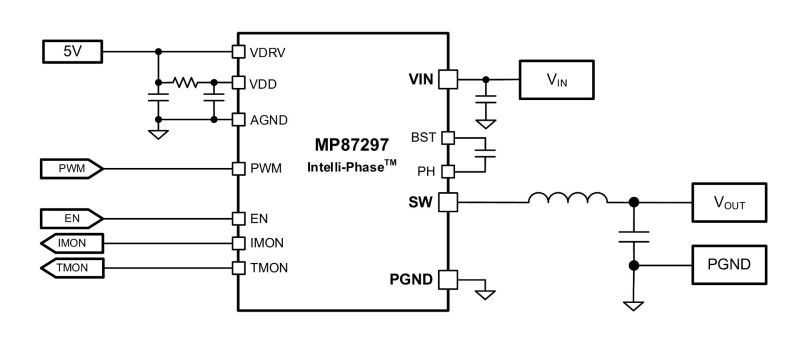 The MP87297 offers many features to simplify system design. This device works with tri-state pulse-width modulation (PWM) signal controllers and features Accu-SenseTM current sensing and temperature sensing to monitor the inductor current (IL) and report the junction temperature (TJ), respectively.