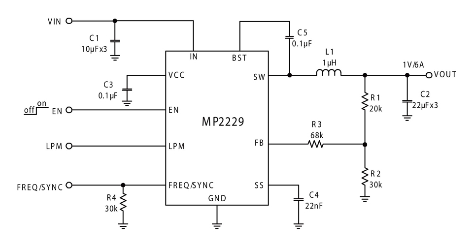 高效 21V, 6A 同步降压变换器,具有外部时钟同步、低功率模式和外部软启动功能
