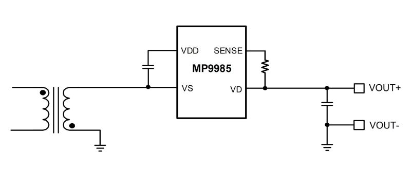 The MP9985 can generate its own supply voltage (VIN) without auxiliary winding, making it well-suited for charger applications with a low output voltage (VOUT) requirement or any other adapter application with a high-side (HS) set-up. The internal ringing detection circuitry prevents the MP9985 from falsely turning on during discontinuous conduction mode (DCM) or quasi-resonant (QR) operation.