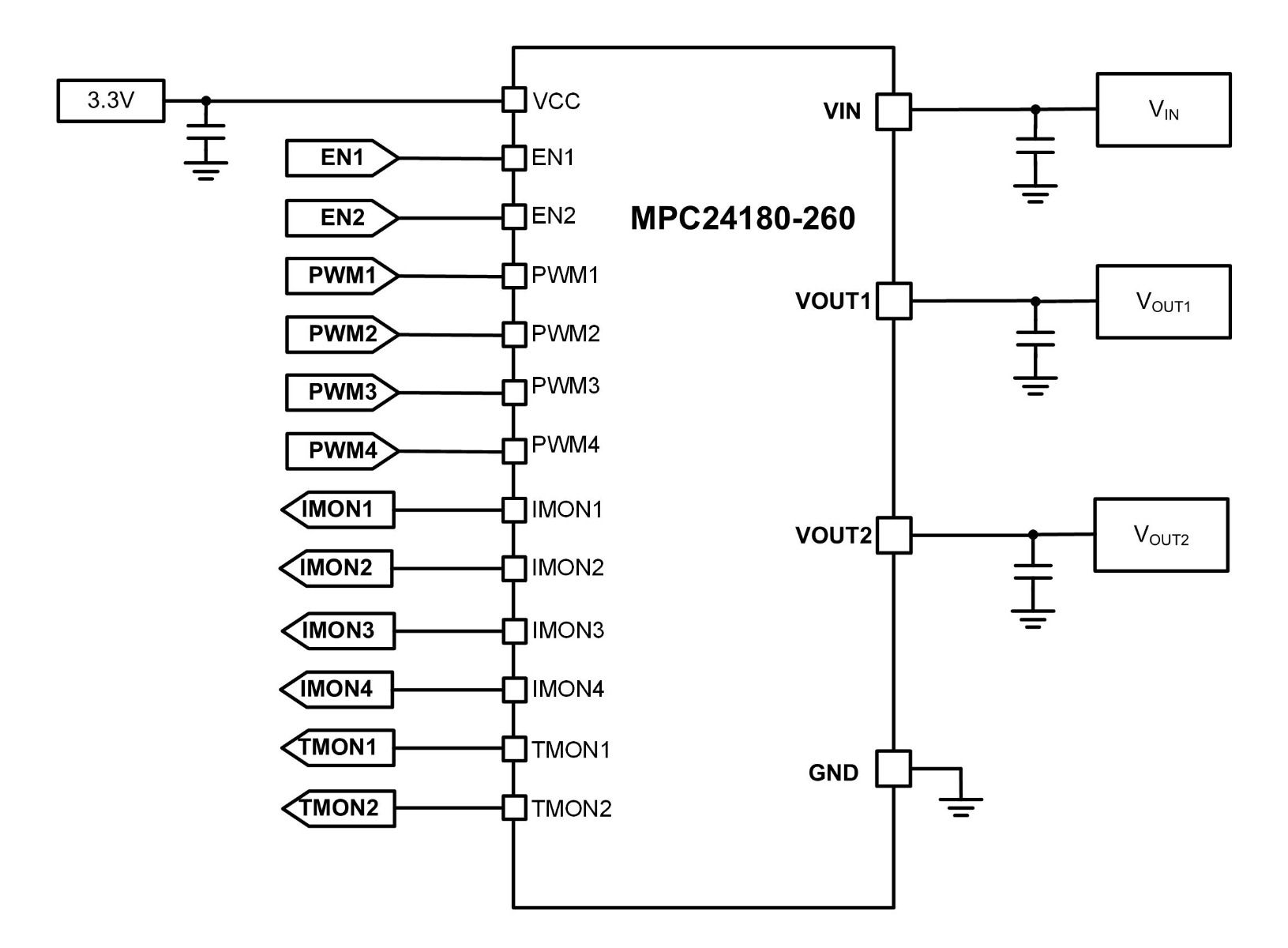 EVMPC22163-2891-Split-02A 将 MP2891 与两个 MPC22163-130 器件结合起来,形成两个可以独立运行的电源轨。