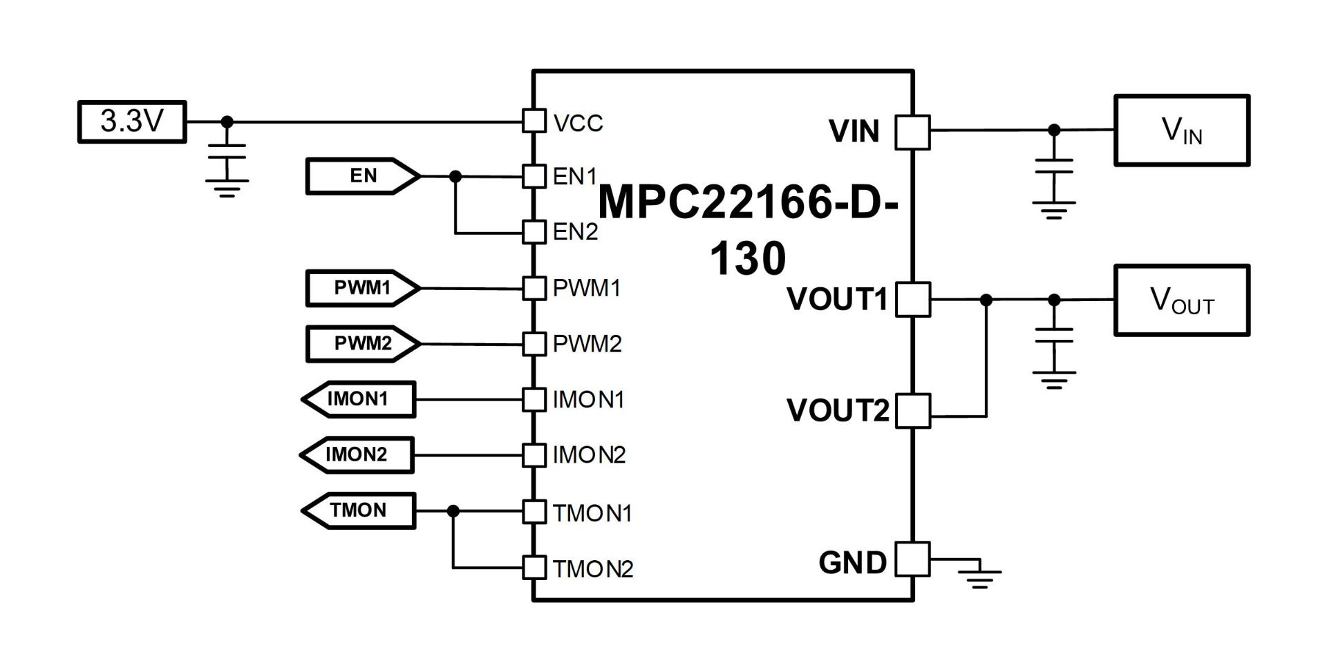MPC22166-A-130 提供两个可单独使用或并联使用的独立输出。它在宽输入电压 (VIN) 范围内可实现高达 130A(每相65A)的输出电流 (IOUTx)。
