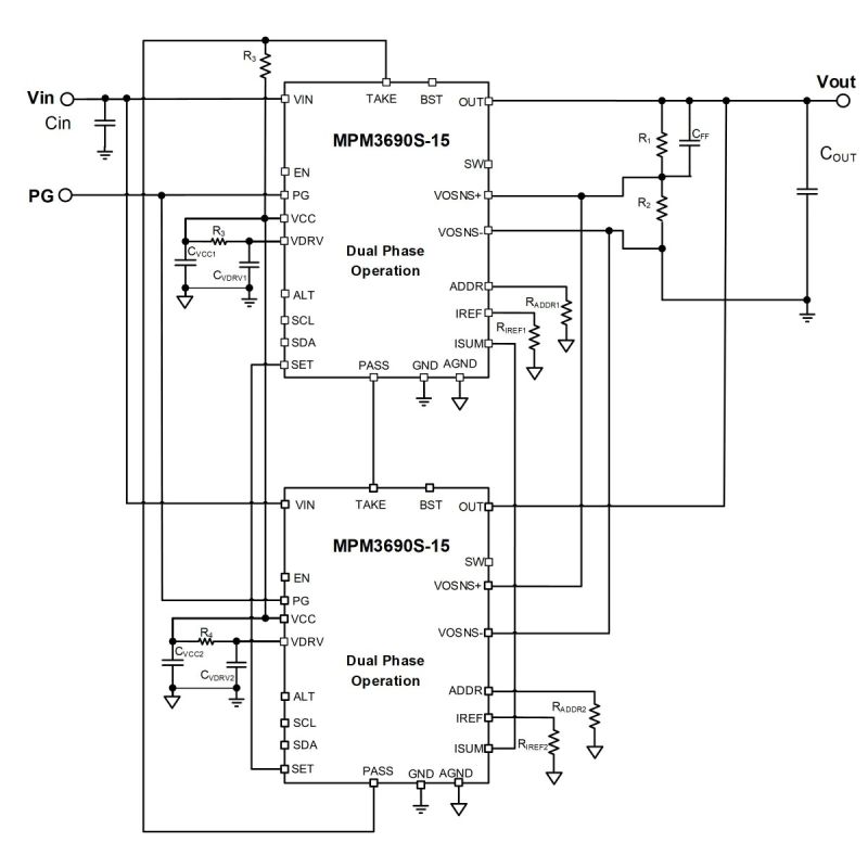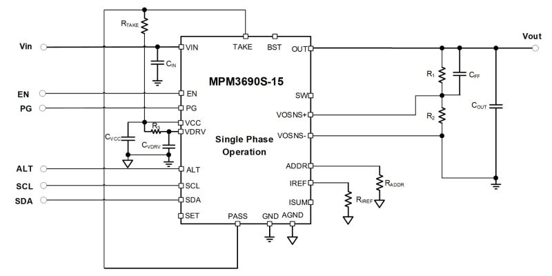 MPM3690S-15 采用 MPS 专有的多相恒定导通时间 (MCOT) 控制,可提供超快瞬态响应和简单的环路补偿。它还提供数字接口以实现模块配置和关键参数的监控。