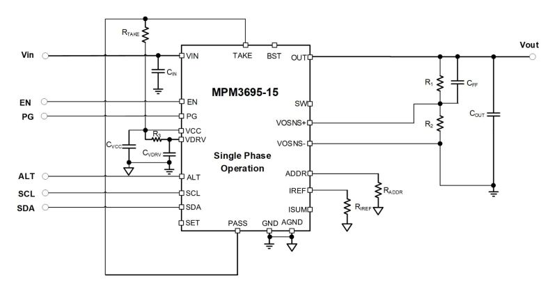MPM3695-15采用MPS特有多相恒定导通时间(MCOT)控制技术,可提供超快瞬态响应和简单环路补偿。它还通过数字接口支持模块配置和关键参数的监控。