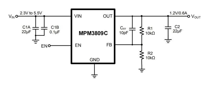 The MPM3809C features internally compensated constant-on-time (COT) control to provide fast transient response and ease loop stabilization. The switching frequency (fSW) is fixed at 2.4MHz. Refer to the MPM3809C datasheet for additional detailed information.