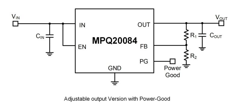 对于MPQ20084-xx1x-AEC1型号,电源正常引脚(PG)为高电平有效输出,可用于实现上电复位(POR)或低电量指示功能。其低热阻特性可确保器件在持续工作时有效对抗功耗发热问题。