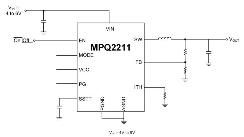The MPQ2211-AEC1 operates from a 3V to 3.6V and 4V to 6V input voltage (VIN) range. To support the 3V to 3.6V VIN range, connect VCC to VIN. The device offers a very compact solution to achieve up to 12A of output current (IOUT) across a wide VIN supply range, with excellent load and line regulation. The MPQ2211-AEC1 operates at high efficiency across a wide IOUT load range.