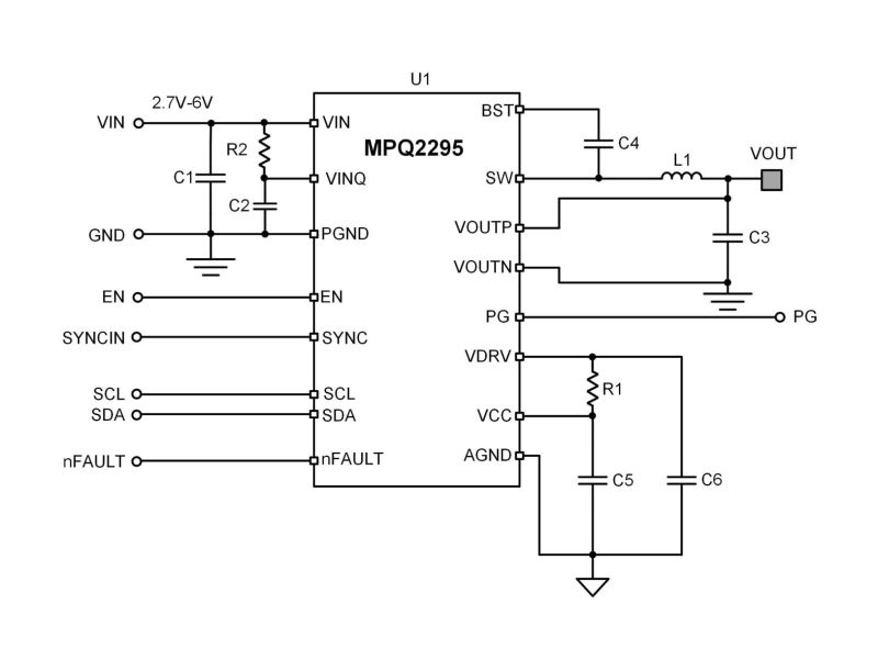 The MPQ2295-AEC1 is a configurable, high-frequency, synchronous buck converter with integrated internal high-side and low-side power MOSFETs (HS-FET and LS-FET, respectively). The device operates from a 2.7V to 6V input and provides 30A of highly efficient output current (IOUT) with fixed-frequency, zero-delay pulse-width modulation PWM (ZDPTM) control for fast transient response.