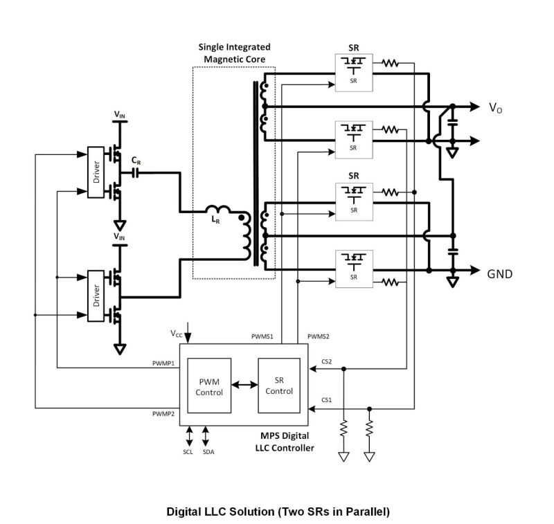 The MPQ2931-AEC1 is a digital LLC controller for full bridges with synchronous rectification control. It provides two pulse-width modulation (PWM) channels for primary-side control, and two PWM channels for secondary-side control.
