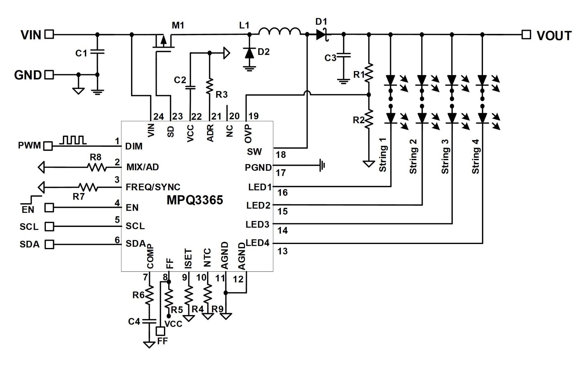MPQ3365A-AEC1产品5通道、最大150mA /通道、升压WLED驱动器,具有15000:1调光比和 I2C接口