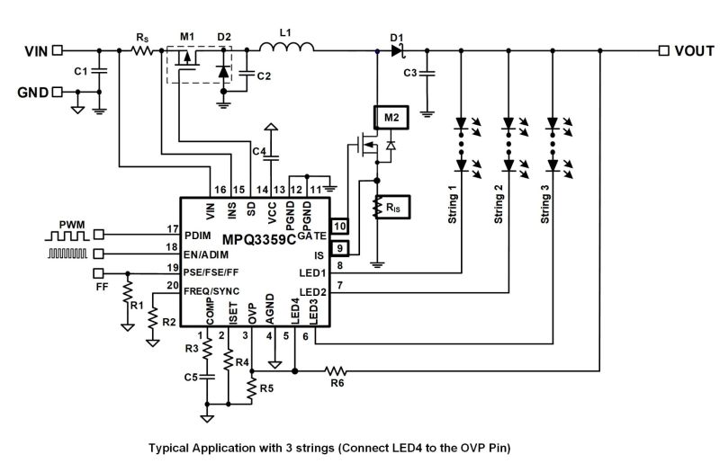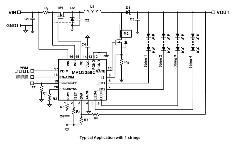 Four channel current sources are applied to the LED cathode to adjust LED brightness. The MPQ3359C regulates the current in each LED string to the value set by an external current-setting resistor, with 2.5% current regulation accuracy between strings. A low headroom voltage is provided to improve efficiency and IC thermal performance.